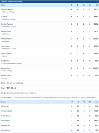 Lucknow opted to bat first and set a target of 200 runs with Quinton de Kock playing a brilliant innings. He shared a 102-run partnership for the first wicket.