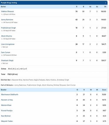 पंजाब किंग्स ने मजबूत शुरुआत की, लेकिन वे जीत को हासिल करने में असफल रहे। उन्होंने 20 ओवर में केवल 177 रन बनाए। शिखर धवन ने 70 रन की दमदार पारी खेली, लेकिन वह अकेले हार को टाल नहीं सके।